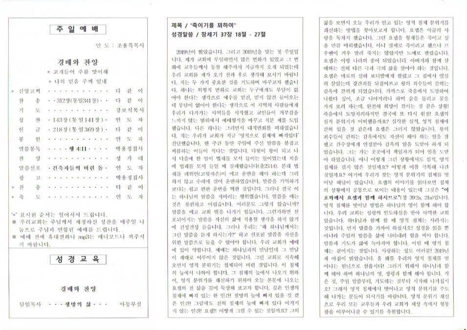 2019. 01. 13 2019년 01월 12일 주보 Share: Older Post 2019. 01. 06 Newer Post 2019년 1월 13일 조용록 목사 말씀 – “건축자들의 버린 돌”
