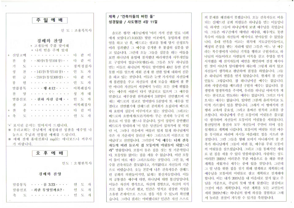 2019. 01. 20 2019년 01월 25일 주보 Share: Older Post 2019년 1월 20일 조용록목사 말씀 – “천하 사람 중에 “ Newer Post 2019년 1월 27일 조용록목사 말씀 – “함께 하느니라”
