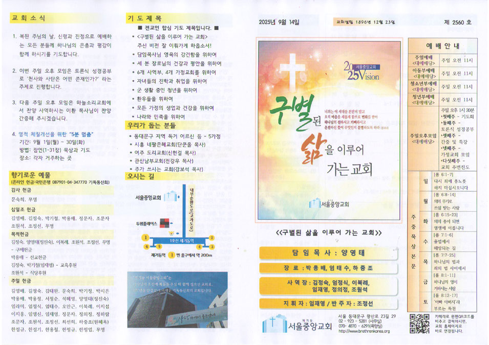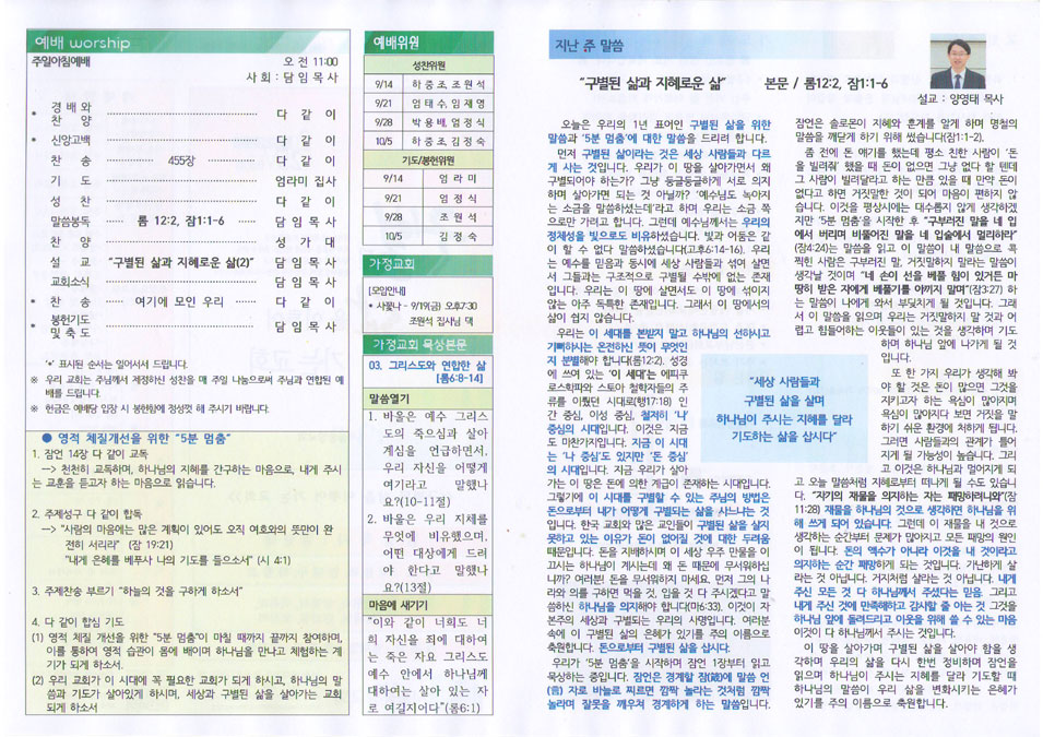 2025년 9월 14일 주보 2025년 09월 12일 주보 Share: Older Post 2025년 9월 7일 주보 Newer Post 2025년 9월 14일 양영태 목사 말씀 – “구별된 삶과 지혜로운 삶(2)”