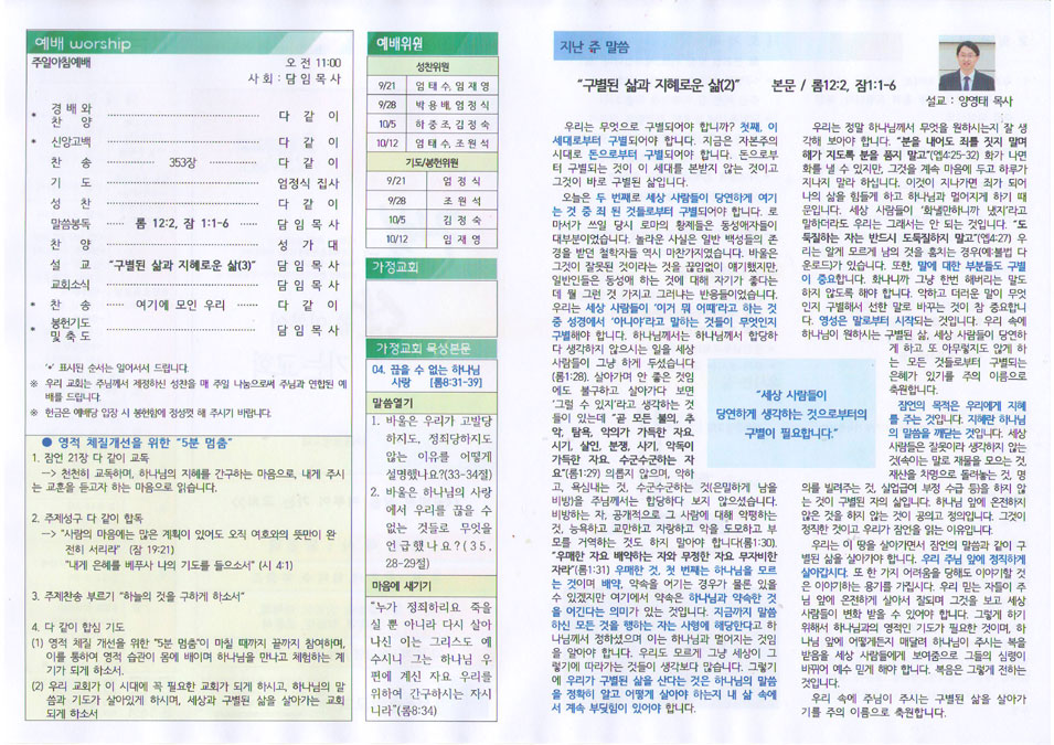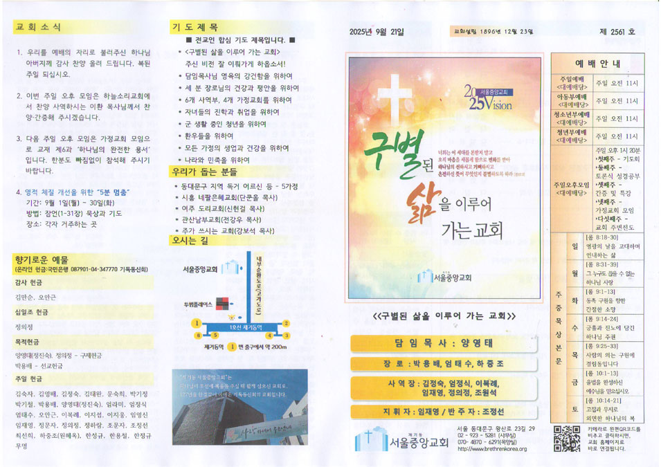 2025년 9월 21일 주보 2025년 09월 22일 주보 Share: Older Post 2025년 9월 21일 양영태 목사 말씀 – “구별된 삶과 지혜로운 삶(3)” Newer Post 2025년 9월 28일 주보