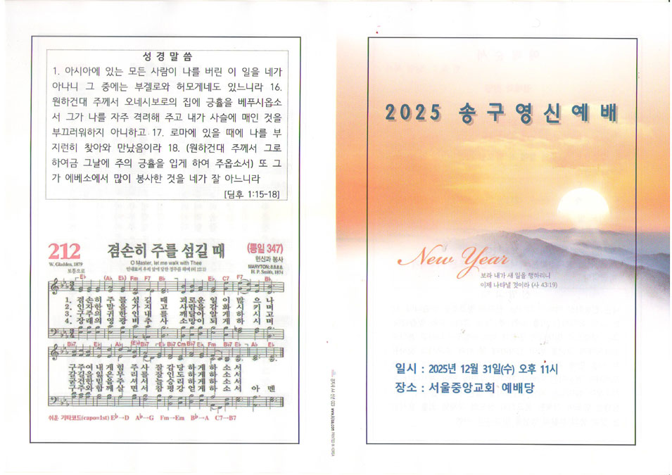 2025년 12월 31일 송구영신 2025년 12월 30일 주보 Share: Older Post 12월 25일 양영태 목사 말씀 – “온 인류의 기쁜 성탄” Newer Post 2026년 1월 4일 양영태 목사 말씀 – “하나님을 안다는 것”